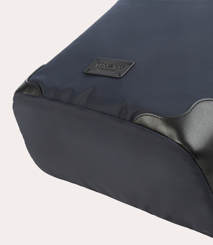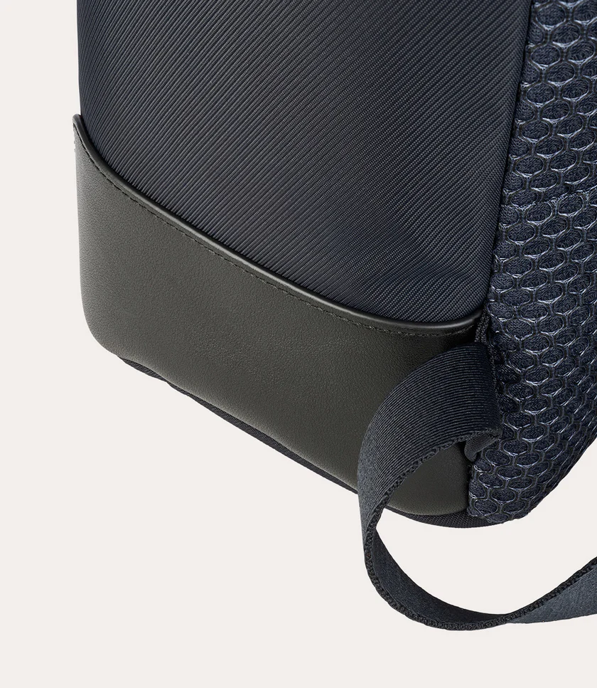 A roomy business backpack that is both essential and elegant. Designed for 15.6” laptops and 16” MacBooks. Made of high-tech fabric produced from recycled plastic and featuring leather accents, the Fine backpack has a roomy external pocket and a double internal compartment separated by zippers, also ideal for short business trips. It has well-organized internal pockets and a padded compartment for your computer. The back panel, embellished with a refined mesh, is equipped with a security pocket and a strap for attaching your backpack to a trolley.