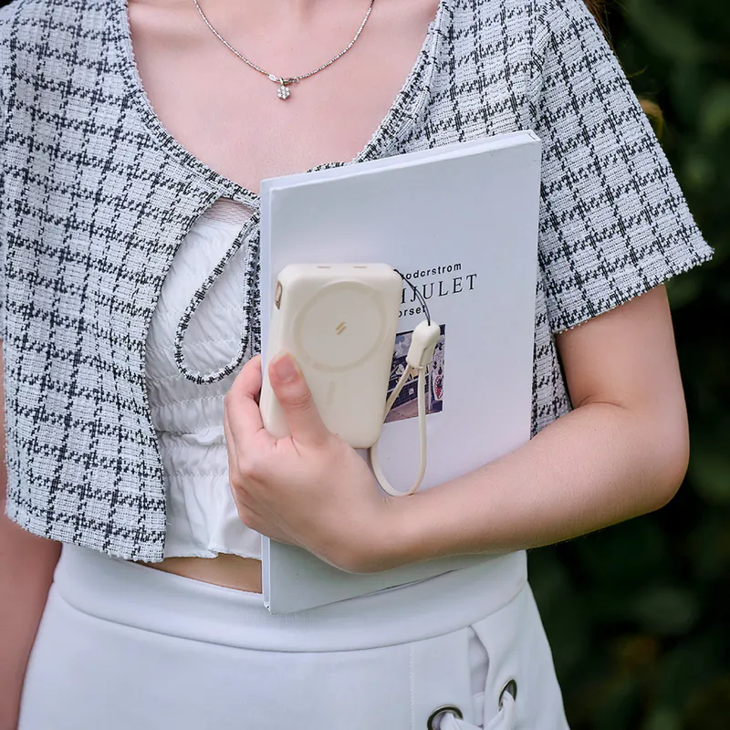 - Built-in 10000mAh power bank with dual USB-C outputs, supports up to 20W per port, and includes a decorative USB-C cable for easy portability.