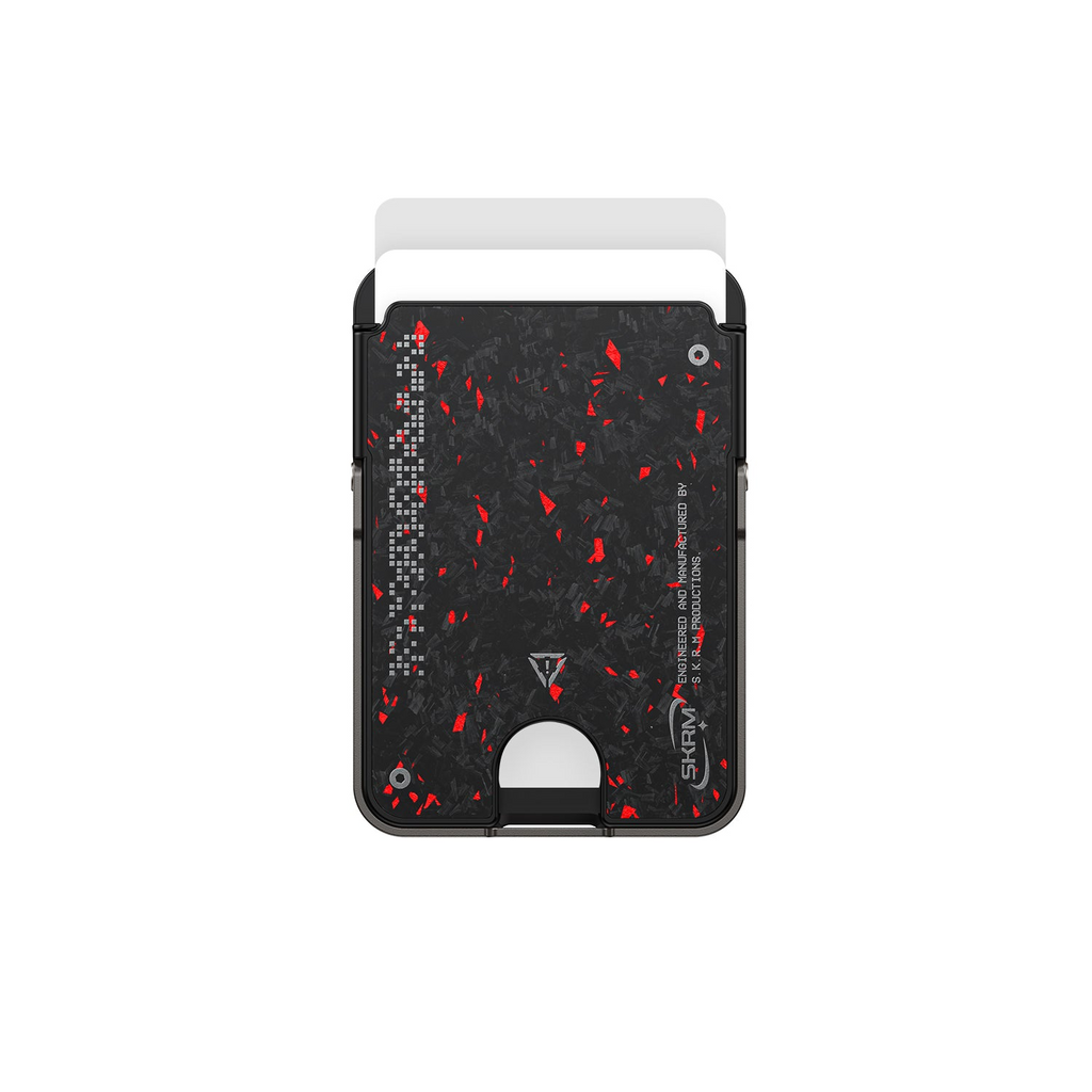 Built with VEKTOR's forged carbon finish and signature red-grey speckled detailing, this magnetic cardholder features an integrated kickstand for portrait or landscape viewing, securely storing up to two cards with RFID protection.